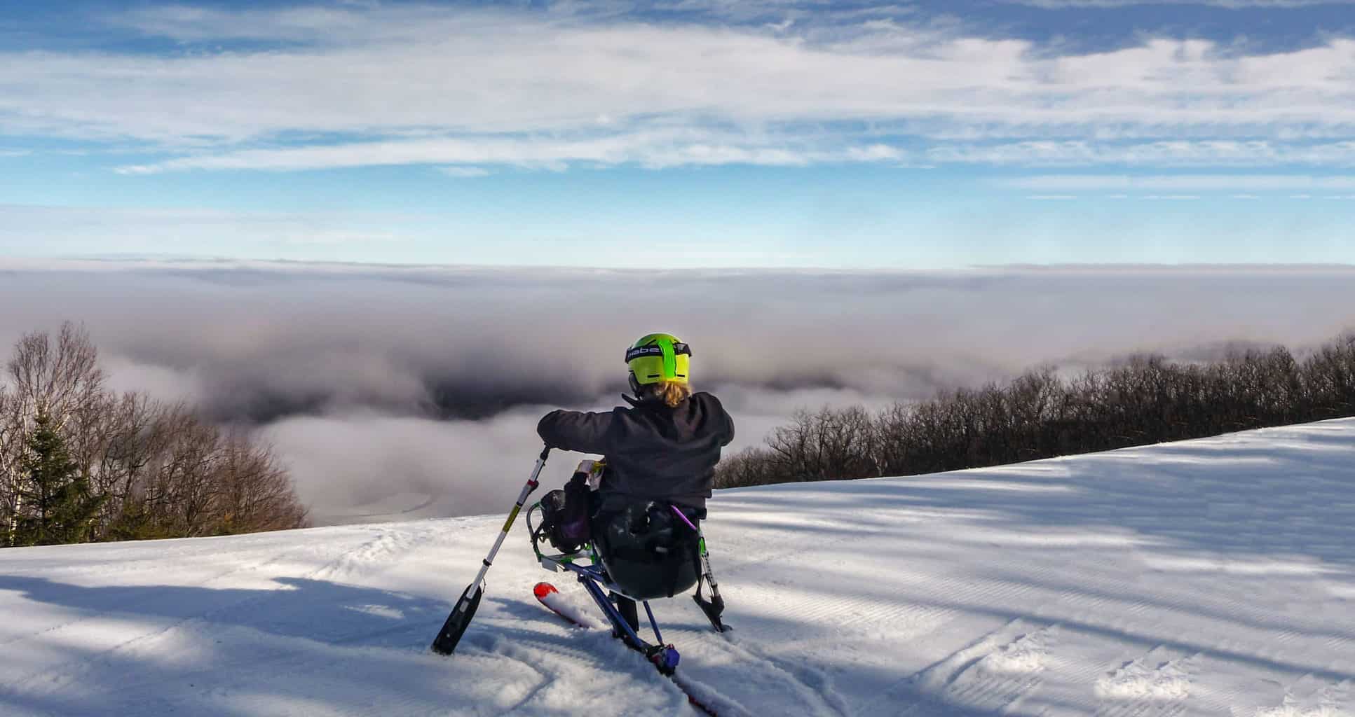 Pictured: PCAS adapted ski program participant at top of the mountain. Location: Camelback Mt. Resort.